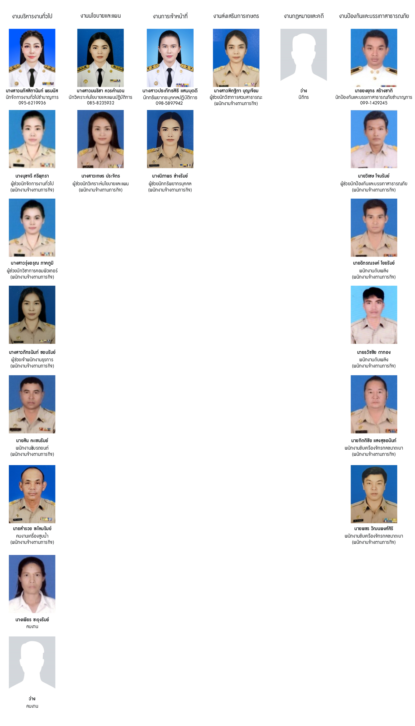 ประกอบด้วย งานบริหารงานทั่วไป,งานการเจ้าหน้าที่,งานแผนงานและงบประมาณ,งานป้องกันและบรรเทาสาธารณภัย,งานส่งเสริมการเกษตร