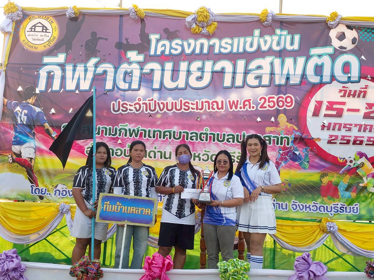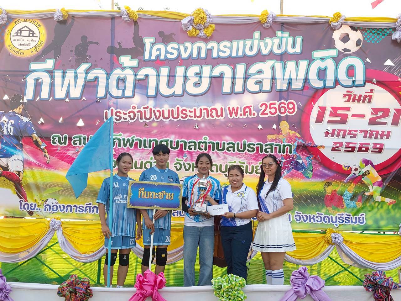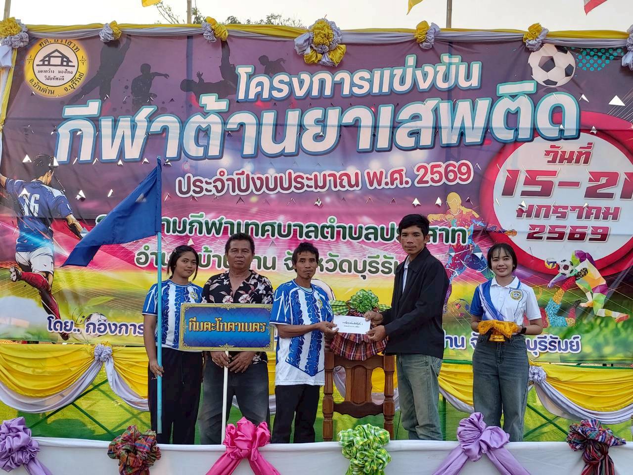 ภาพที่เกี่ยวข้อง เมื่อวันที่ 21 มกราคม พ.ศ.2569 นายพนาพัฒน์ ชะลุนรัมย์ นายกเทศมนตรีตำบลปราสาท ประธานจัดการแข่งขันกีฬาต้านยาเสพติดตำบลปราสาท ได้กล่าวรายงานผลการดำเนินการจัดโครงการแข่งขันกีฬาต้านยาเสพติด โดย นายกิตติวัฒน์ ปิติเรืองสิทธิ์ รองปลัดเทศบาล ปฏิบัติราชการแทน ปลัดเทศบาลตำบลปราสาท พร้อมด้วยคณะผู้บริหาร สมาชิกสภาเทศบาล หัวหน้าส่วนราชการ พนักงานเทศบาลตำบลปราสาท กำนัน ผู้ใหญ่บ้าน ทั้ง 18 หมู่บ้าน และนักกีฬาตำบลปราสาท ให้เกียรติร่วมพิธีปิด "โครงการแข่งขันกีฬาต้านยาเสพติดตำบลปราสาท ประจำปีงบประมาณ 2569 ในการแข่งขันกีฬาต้านยาเสพติดตำบลปราสาท ประจำปีงบประมาณ 2569 นี้ ในระหว่างวันที่ 15-21 มกราคม 2569 ณ สนามกีฬาเทศบาลตำบลปราสาท อำเภอบ้านด่าน จังหวัดบุรีรัมย์ ซึ่งได้ดำเนินการจัดการแข่งขันเสร็จสิ้นเป็นที่เรียบร้อย และเป็นไปตามวัตถุประประสงค์ทุกประการ
