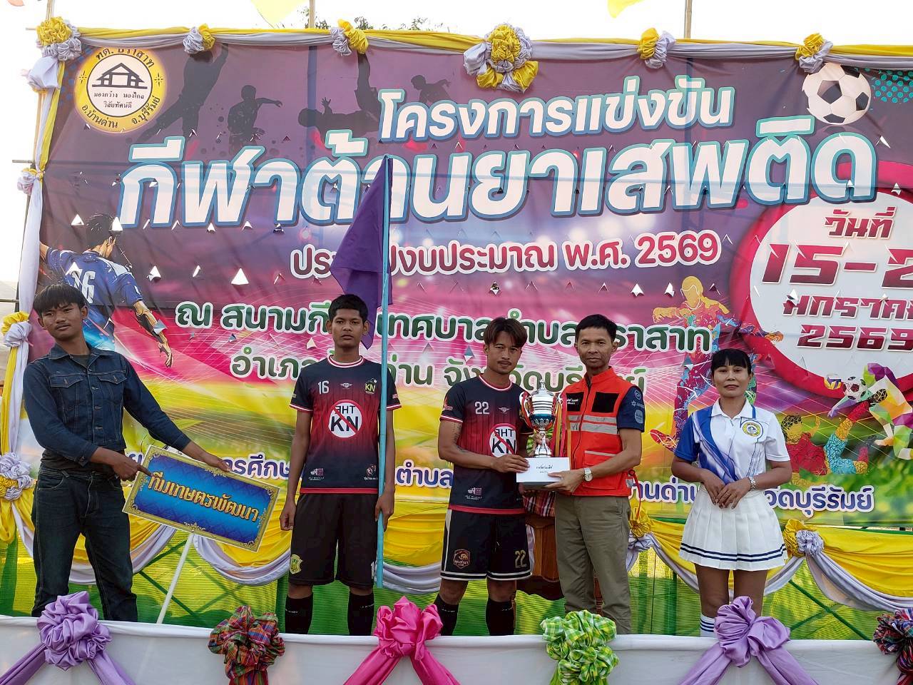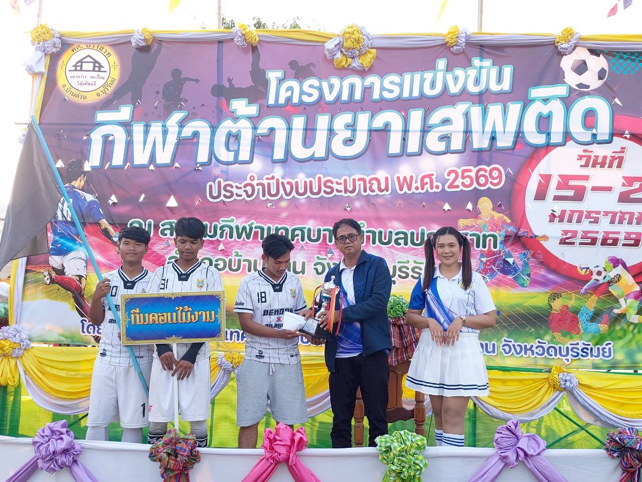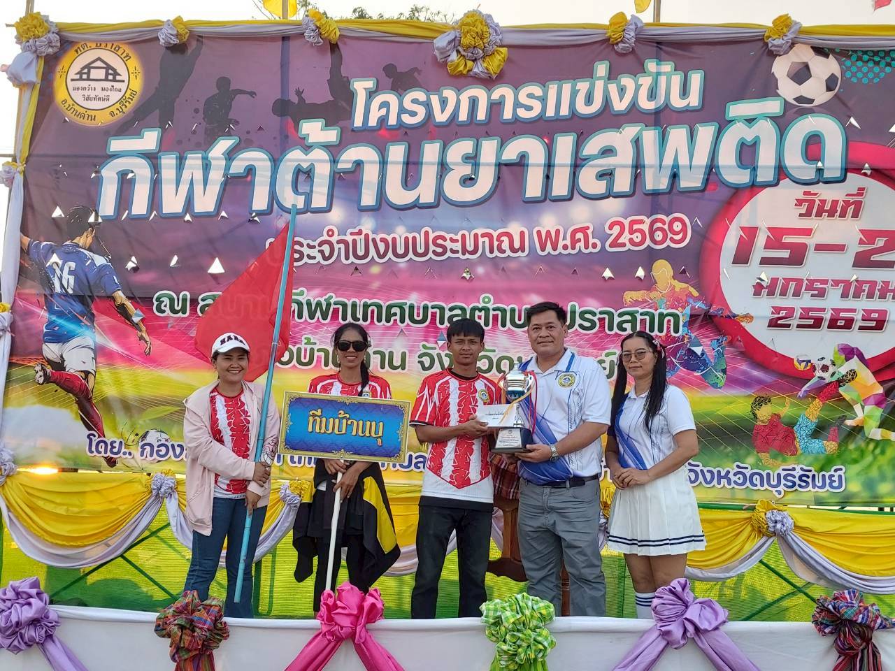 ภาพที่เกี่ยวข้อง เมื่อวันที่ 21 มกราคม พ.ศ.2569 นายพนาพัฒน์ ชะลุนรัมย์ นายกเทศมนตรีตำบลปราสาท ประธานจัดการแข่งขันกีฬาต้านยาเสพติดตำบลปราสาท ได้กล่าวรายงานผลการดำเนินการจัดโครงการแข่งขันกีฬาต้านยาเสพติด โดย นายกิตติวัฒน์ ปิติเรืองสิทธิ์ รองปลัดเทศบาล ปฏิบัติราชการแทน ปลัดเทศบาลตำบลปราสาท พร้อมด้วยคณะผู้บริหาร สมาชิกสภาเทศบาล หัวหน้าส่วนราชการ พนักงานเทศบาลตำบลปราสาท กำนัน ผู้ใหญ่บ้าน ทั้ง 18 หมู่บ้าน และนักกีฬาตำบลปราสาท ให้เกียรติร่วมพิธีปิด "โครงการแข่งขันกีฬาต้านยาเสพติดตำบลปราสาท ประจำปีงบประมาณ 2569 ในการแข่งขันกีฬาต้านยาเสพติดตำบลปราสาท ประจำปีงบประมาณ 2569 นี้ ในระหว่างวันที่ 15-21 มกราคม 2569 ณ สนามกีฬาเทศบาลตำบลปราสาท อำเภอบ้านด่าน จังหวัดบุรีรัมย์ ซึ่งได้ดำเนินการจัดการแข่งขันเสร็จสิ้นเป็นที่เรียบร้อย และเป็นไปตามวัตถุประประสงค์ทุกประการ
