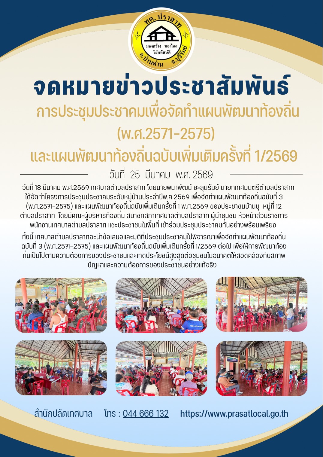 วันพุธ ที่ 25 เดือน มีนาคม พ.ศ.2569 เทศบาลตำบลปราสาท นำโดยนายพนาพัฒน์ ชะลุนรัมย์ นายกเทศมนตรีตำบลปราสาท พร้อมด้วยคณะผู้บริหาร สมาชิกสภาเทศบาล หัวหน้าส่วนราชการ เจ้าหน้าที่เทศบาลตำบลปราสาท ลงพื้นที่เพื่อจัดทำโครงการประชาคมระดับหมู่บ้าน ประจำปี 2569 เพื่อจัดทำแผนพัฒนาท้องถิ่น ฉบับที่ 3 (พ.ศ. 2571 - 2575) ระหว่างวันที่ 16- 26 มีนาคม 2569 โดยในวัน 25 มีนาคม พ.ศ.2569 ช่วงเช้า ประชาคมหมู่บ้าน หมู่ที่ 12 บ้านบุ ช่วงบ่าย ประชาคมหมู่บ้าน หมู่ที่ 13 บ้านนาล้อม