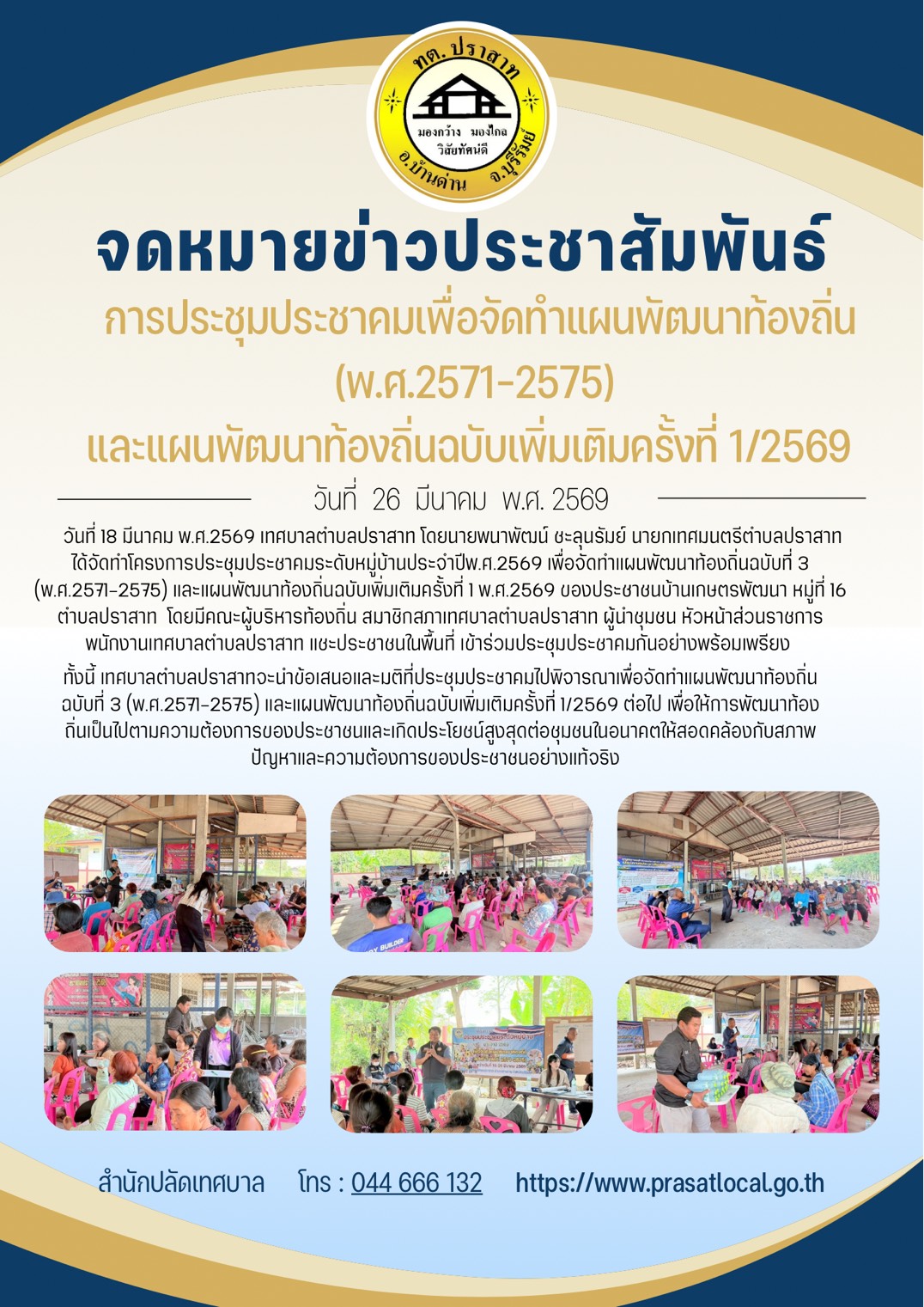 วันพฤหัสบดี ที่ 26 เดือน มีนาคม พ.ศ.2569 เทศบาลตำบลปราสาท นำโดยนายพนาพัฒน์ ชะลุนรัมย์ นายกเทศมนตรีตำบลปราสาท พร้อมด้วยคณะผู้บริหาร สมาชิกสภาเทศบาล หัวหน้าส่วนราชการ เจ้าหน้าที่เทศบาลตำบลปราสาท ลงพื้นที่เพื่อจัดทำโครงการประชาคมระดับหมู่บ้าน ประจำปี 2569 เพื่อจัดทำแผนพัฒนาท้องถิ่น ฉบับที่ 3 (พ.ศ. 2571 - 2575) ระหว่างวันที่ 16- 26 มีนาคม 2569 โดยในวัน 25 มีนาคม พ.ศ.2569 ช่วงเช้า ประชาคมหมู่บ้าน หมู่ที่ 16 บ้านเกษตรพัฒนา ช่วงบ่าย ประชาคมหมู่บ้าน หมู่ที่ 17 บ้านหนองสะแก
