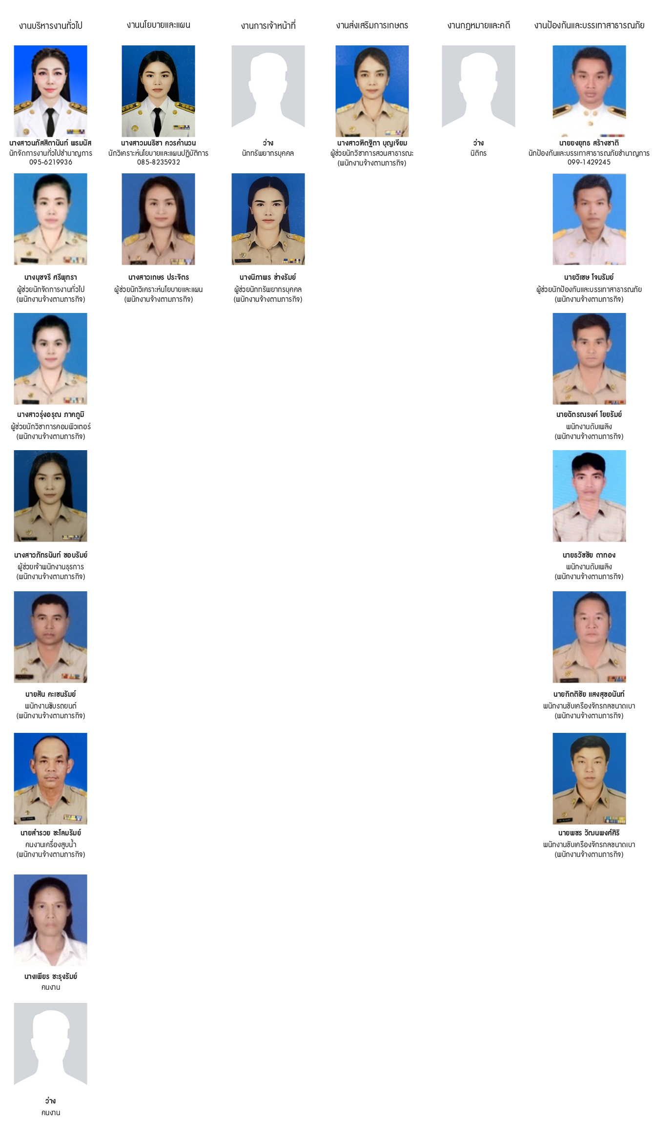ประกอบด้วย งานบริหารงานทั่วไป,งานการเจ้าหน้าที่,งานแผนงานและงบประมาณ,งานป้องกันและบรรเทาสาธารณภัย,งานส่งเสริมการเกษตร