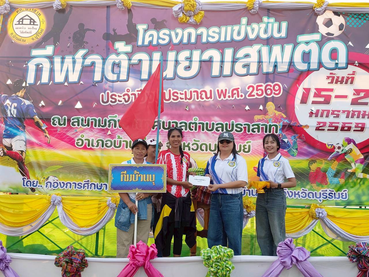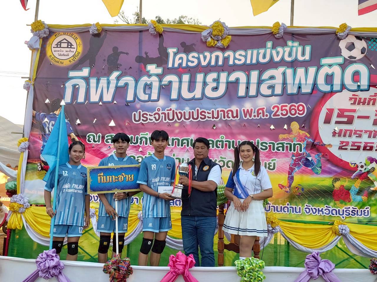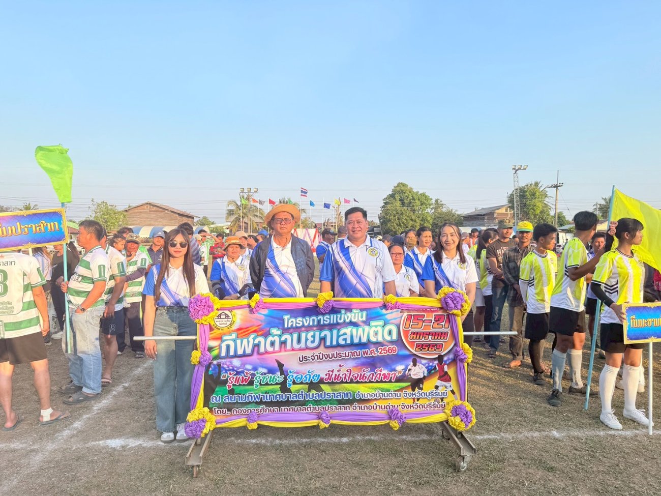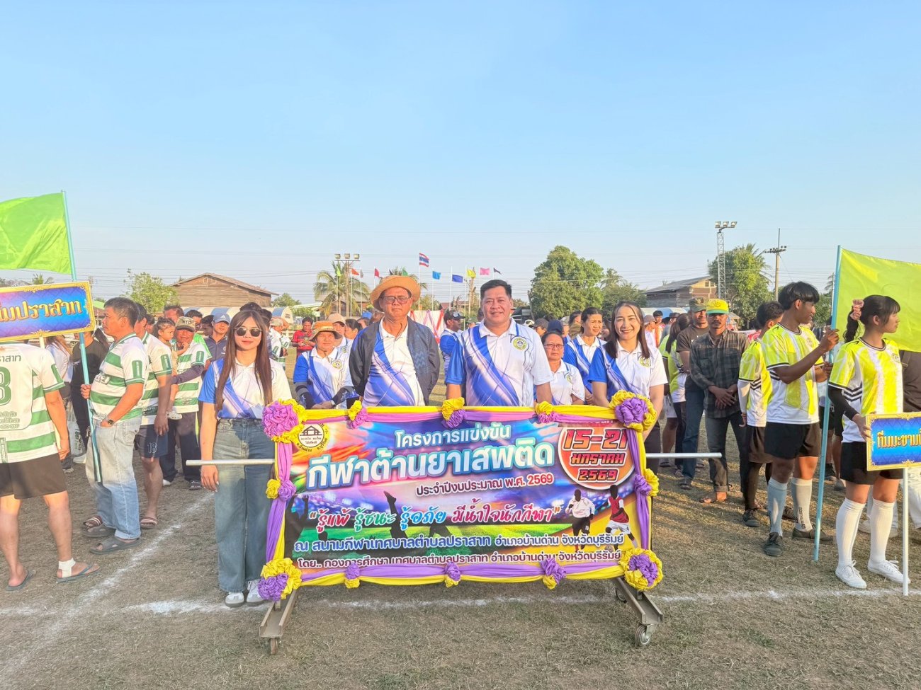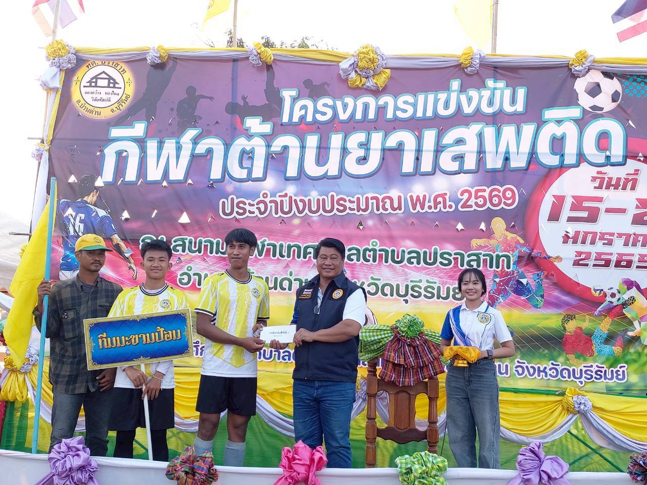 ภาพที่เกี่ยวข้อง เมื่อวันที่ 21 มกราคม พ.ศ.2569 นายพนาพัฒน์ ชะลุนรัมย์ นายกเทศมนตรีตำบลปราสาท ประธานจัดการแข่งขันกีฬาต้านยาเสพติดตำบลปราสาท ได้กล่าวรายงานผลการดำเนินการจัดโครงการแข่งขันกีฬาต้านยาเสพติด โดย นายกิตติวัฒน์ ปิติเรืองสิทธิ์ รองปลัดเทศบาล ปฏิบัติราชการแทน ปลัดเทศบาลตำบลปราสาท พร้อมด้วยคณะผู้บริหาร สมาชิกสภาเทศบาล หัวหน้าส่วนราชการ พนักงานเทศบาลตำบลปราสาท กำนัน ผู้ใหญ่บ้าน ทั้ง 18 หมู่บ้าน และนักกีฬาตำบลปราสาท ให้เกียรติร่วมพิธีปิด "โครงการแข่งขันกีฬาต้านยาเสพติดตำบลปราสาท ประจำปีงบประมาณ 2569 ในการแข่งขันกีฬาต้านยาเสพติดตำบลปราสาท ประจำปีงบประมาณ 2569 นี้ ในระหว่างวันที่ 15-21 มกราคม 2569 ณ สนามกีฬาเทศบาลตำบลปราสาท อำเภอบ้านด่าน จังหวัดบุรีรัมย์ ซึ่งได้ดำเนินการจัดการแข่งขันเสร็จสิ้นเป็นที่เรียบร้อย และเป็นไปตามวัตถุประประสงค์ทุกประการ