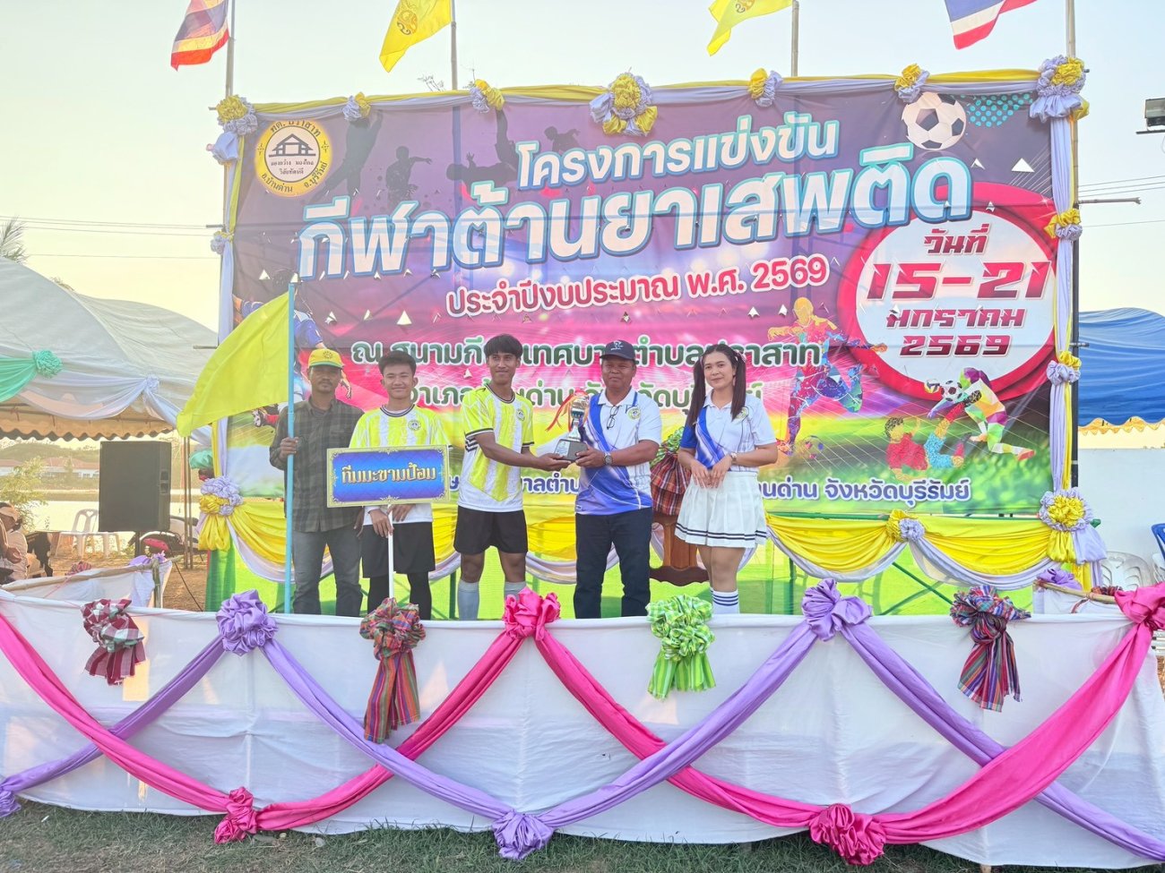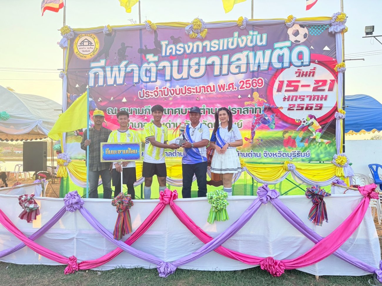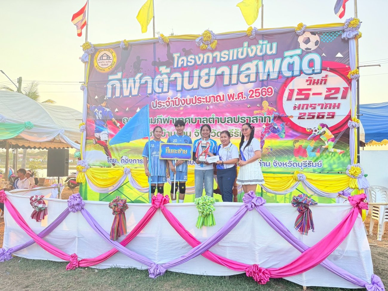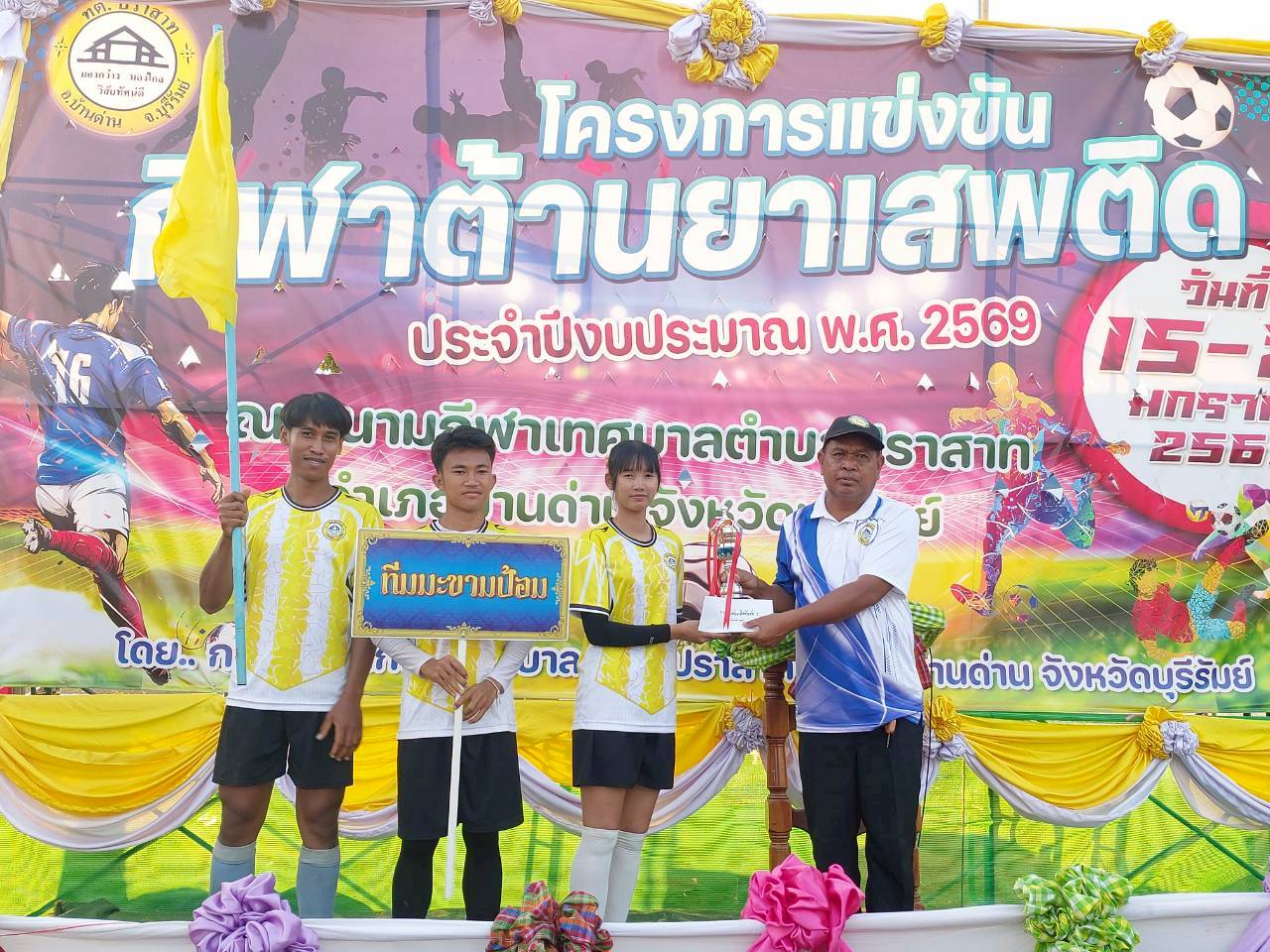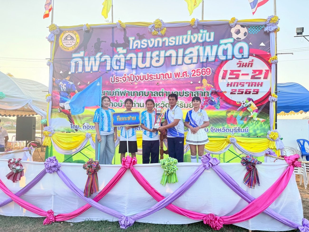 ภาพที่เกี่ยวข้อง เมื่อวันที่ 21 มกราคม พ.ศ.2569 นายพนาพัฒน์ ชะลุนรัมย์ นายกเทศมนตรีตำบลปราสาท ประธานจัดการแข่งขันกีฬาต้านยาเสพติดตำบลปราสาท ได้กล่าวรายงานผลการดำเนินการจัดโครงการแข่งขันกีฬาต้านยาเสพติด โดย นายกิตติวัฒน์ ปิติเรืองสิทธิ์ รองปลัดเทศบาล ปฏิบัติราชการแทน ปลัดเทศบาลตำบลปราสาท พร้อมด้วยคณะผู้บริหาร สมาชิกสภาเทศบาล หัวหน้าส่วนราชการ พนักงานเทศบาลตำบลปราสาท กำนัน ผู้ใหญ่บ้าน ทั้ง 18 หมู่บ้าน และนักกีฬาตำบลปราสาท ให้เกียรติร่วมพิธีปิด "โครงการแข่งขันกีฬาต้านยาเสพติดตำบลปราสาท ประจำปีงบประมาณ 2569 ในการแข่งขันกีฬาต้านยาเสพติดตำบลปราสาท ประจำปีงบประมาณ 2569 นี้ ในระหว่างวันที่ 15-21 มกราคม 2569 ณ สนามกีฬาเทศบาลตำบลปราสาท อำเภอบ้านด่าน จังหวัดบุรีรัมย์ ซึ่งได้ดำเนินการจัดการแข่งขันเสร็จสิ้นเป็นที่เรียบร้อย และเป็นไปตามวัตถุประประสงค์ทุกประการ