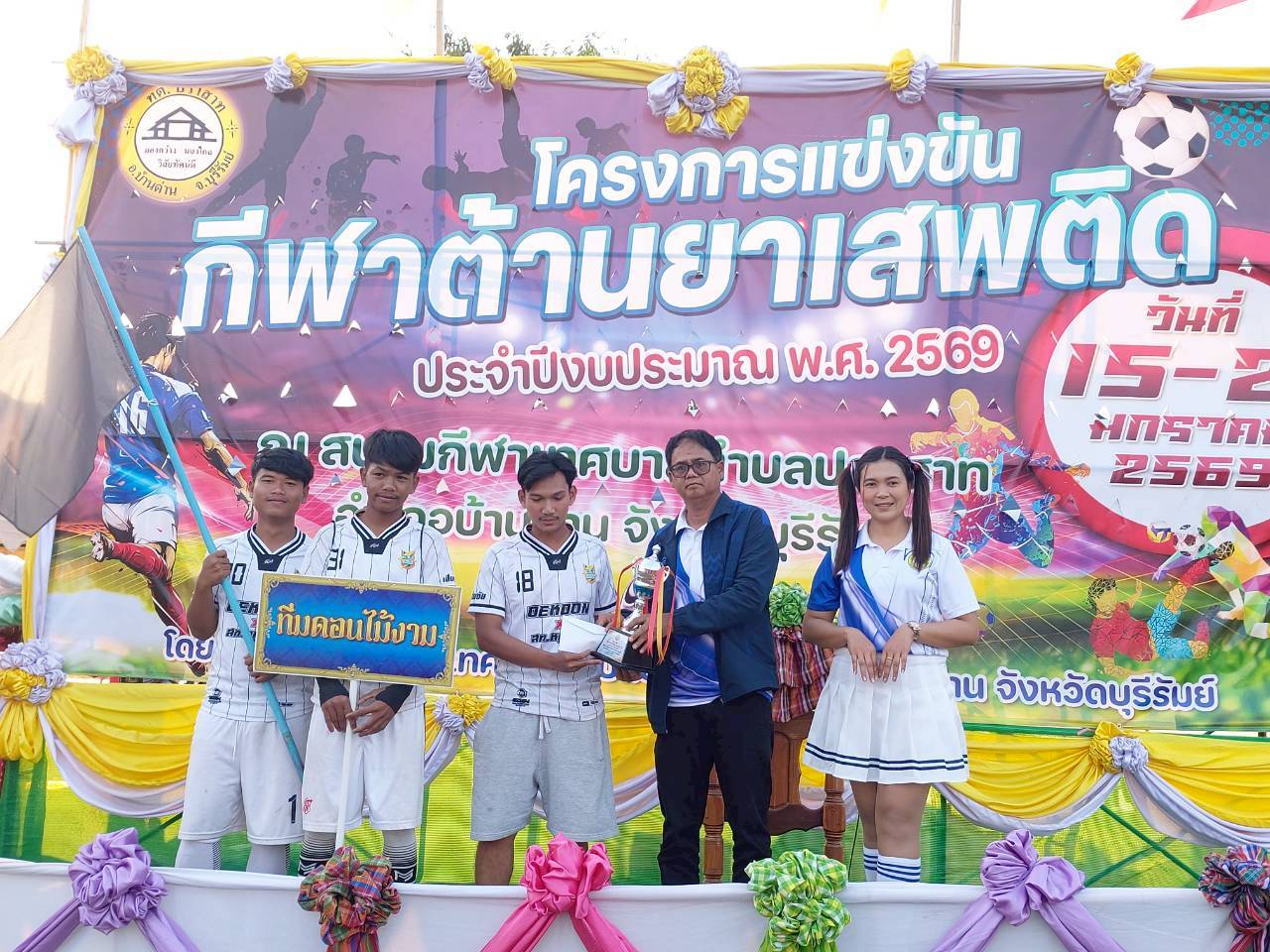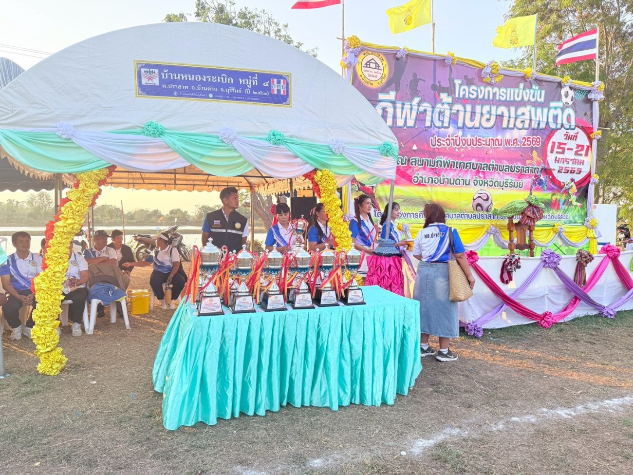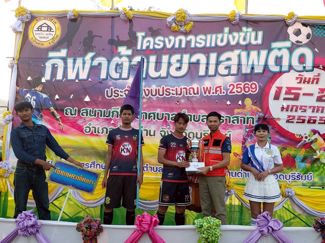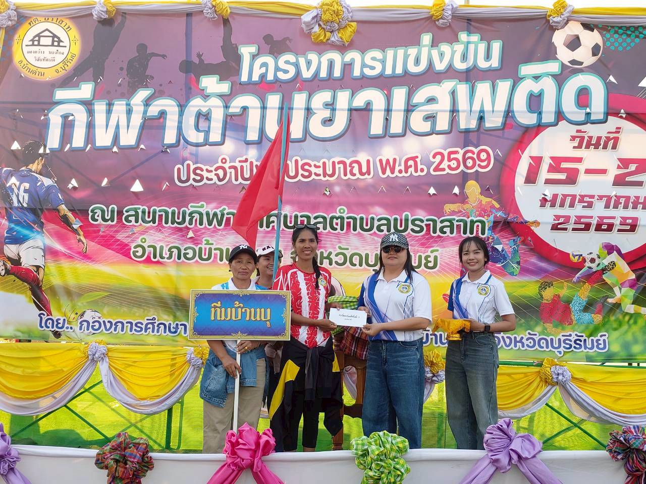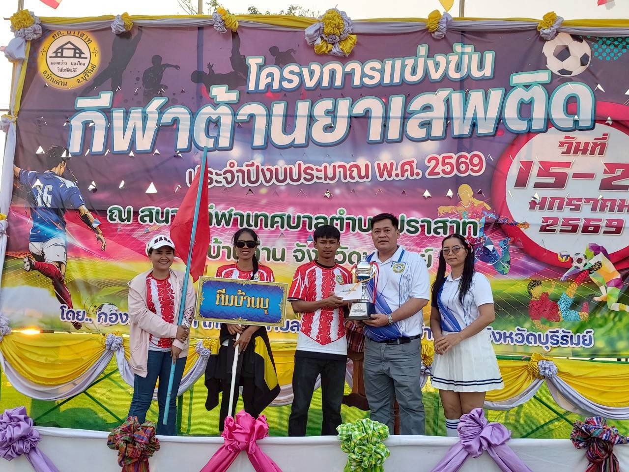 ภาพที่เกี่ยวข้อง เมื่อวันที่ 21 มกราคม พ.ศ.2569 นายพนาพัฒน์ ชะลุนรัมย์ นายกเทศมนตรีตำบลปราสาท ประธานจัดการแข่งขันกีฬาต้านยาเสพติดตำบลปราสาท ได้กล่าวรายงานผลการดำเนินการจัดโครงการแข่งขันกีฬาต้านยาเสพติด โดย นายกิตติวัฒน์ ปิติเรืองสิทธิ์ รองปลัดเทศบาล ปฏิบัติราชการแทน ปลัดเทศบาลตำบลปราสาท พร้อมด้วยคณะผู้บริหาร สมาชิกสภาเทศบาล หัวหน้าส่วนราชการ พนักงานเทศบาลตำบลปราสาท กำนัน ผู้ใหญ่บ้าน ทั้ง 18 หมู่บ้าน และนักกีฬาตำบลปราสาท ให้เกียรติร่วมพิธีปิด "โครงการแข่งขันกีฬาต้านยาเสพติดตำบลปราสาท ประจำปีงบประมาณ 2569 ในการแข่งขันกีฬาต้านยาเสพติดตำบลปราสาท ประจำปีงบประมาณ 2569 นี้ ในระหว่างวันที่ 15-21 มกราคม 2569 ณ สนามกีฬาเทศบาลตำบลปราสาท อำเภอบ้านด่าน จังหวัดบุรีรัมย์ ซึ่งได้ดำเนินการจัดการแข่งขันเสร็จสิ้นเป็นที่เรียบร้อย และเป็นไปตามวัตถุประประสงค์ทุกประการ